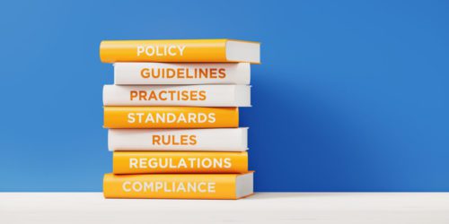 Books of Compliance And Regulations In Front Grey Wall